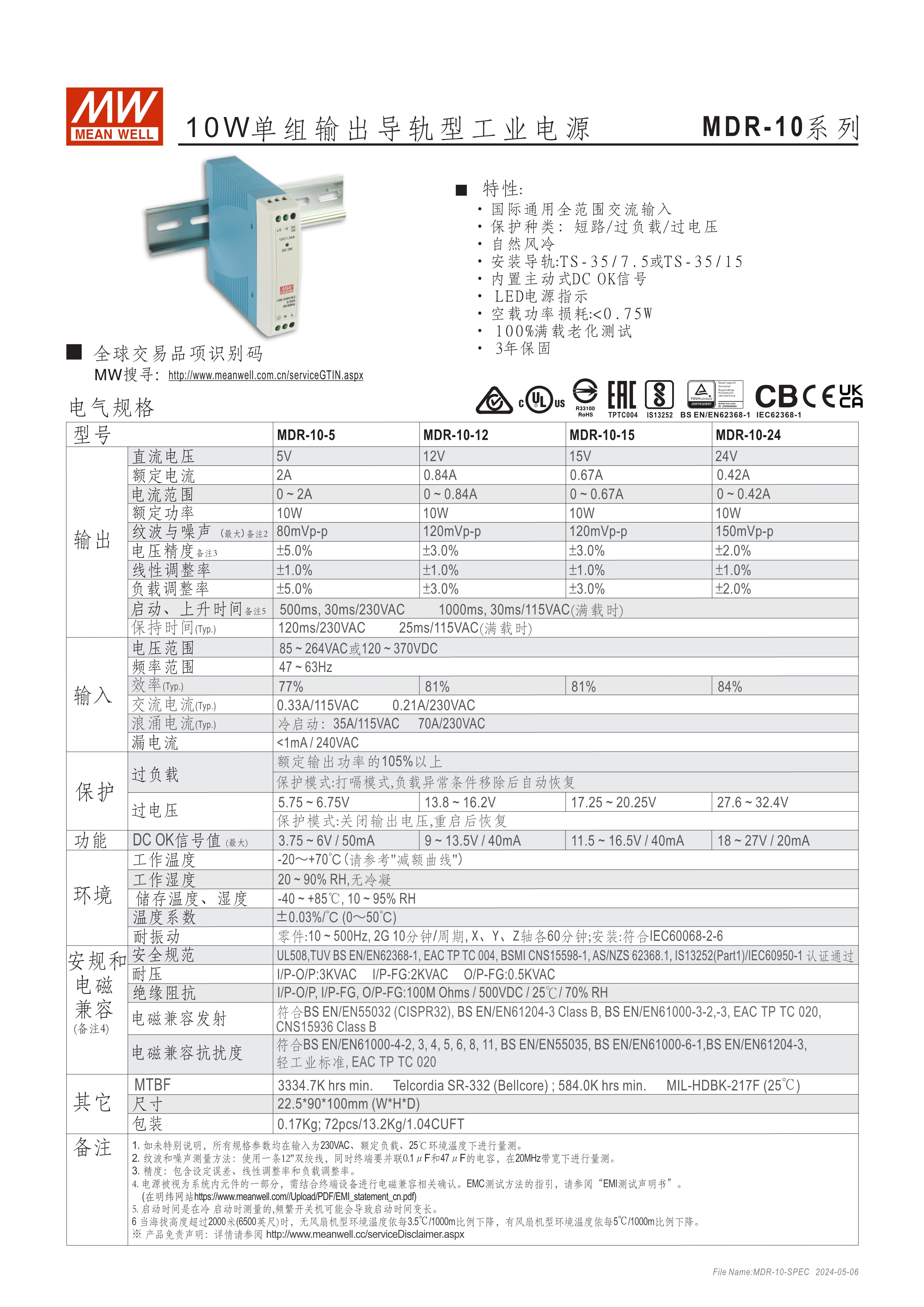 超薄型塑料機(jī)殼 單相,全范圍輸入 空載待機(jī)消耗瓦數(shù)<0.75W~1W 適合安裝于DIN rail TS-35 / 7.5 或 15 內(nèi)建主動(dòng)式功率因子矯正功能(active PFC) DC OK訊號輸出(MDR-10/20) DC OK繼電器接點(diǎn)(relay contact)信號輸出(MDR-40/60/100) 適用于Class I, Div 2 T4危險(xiǎn)區(qū)域(MDR-40/60)