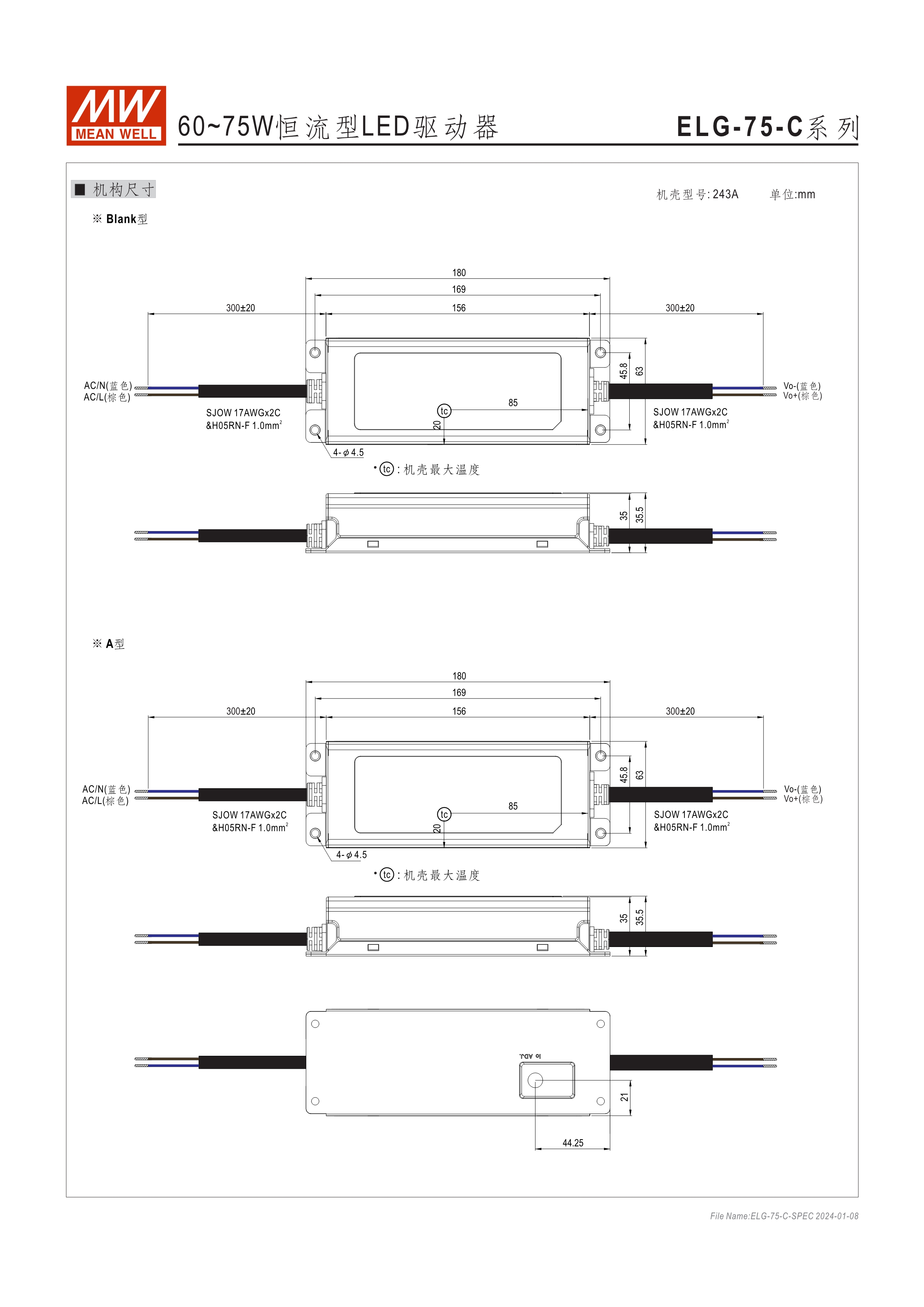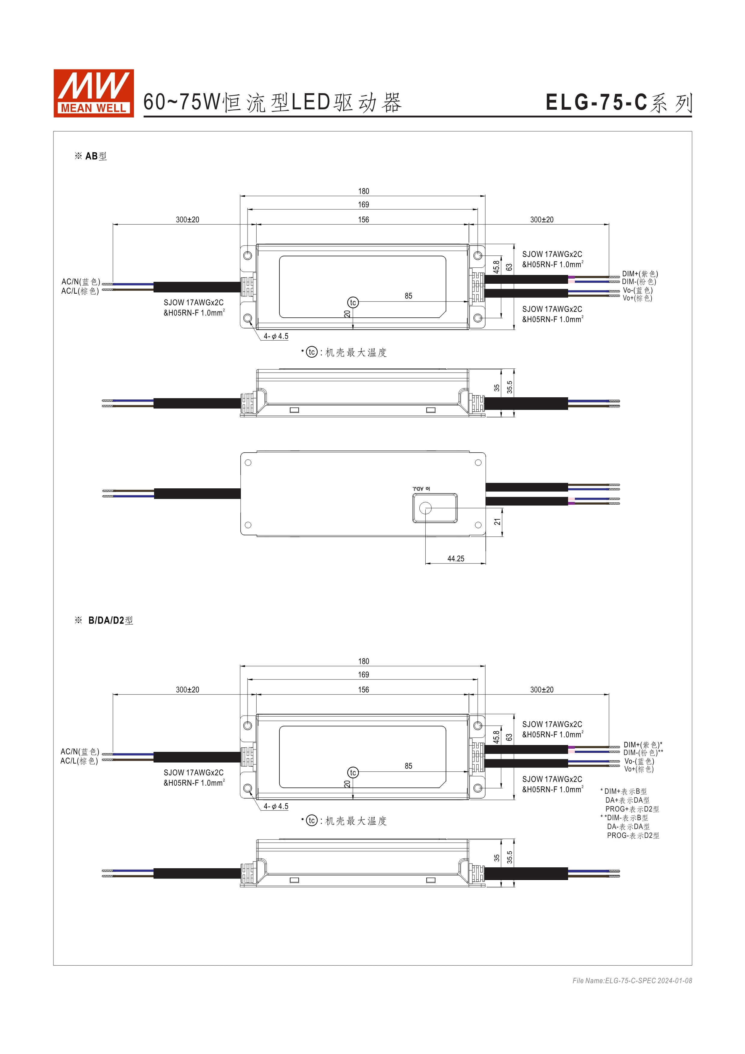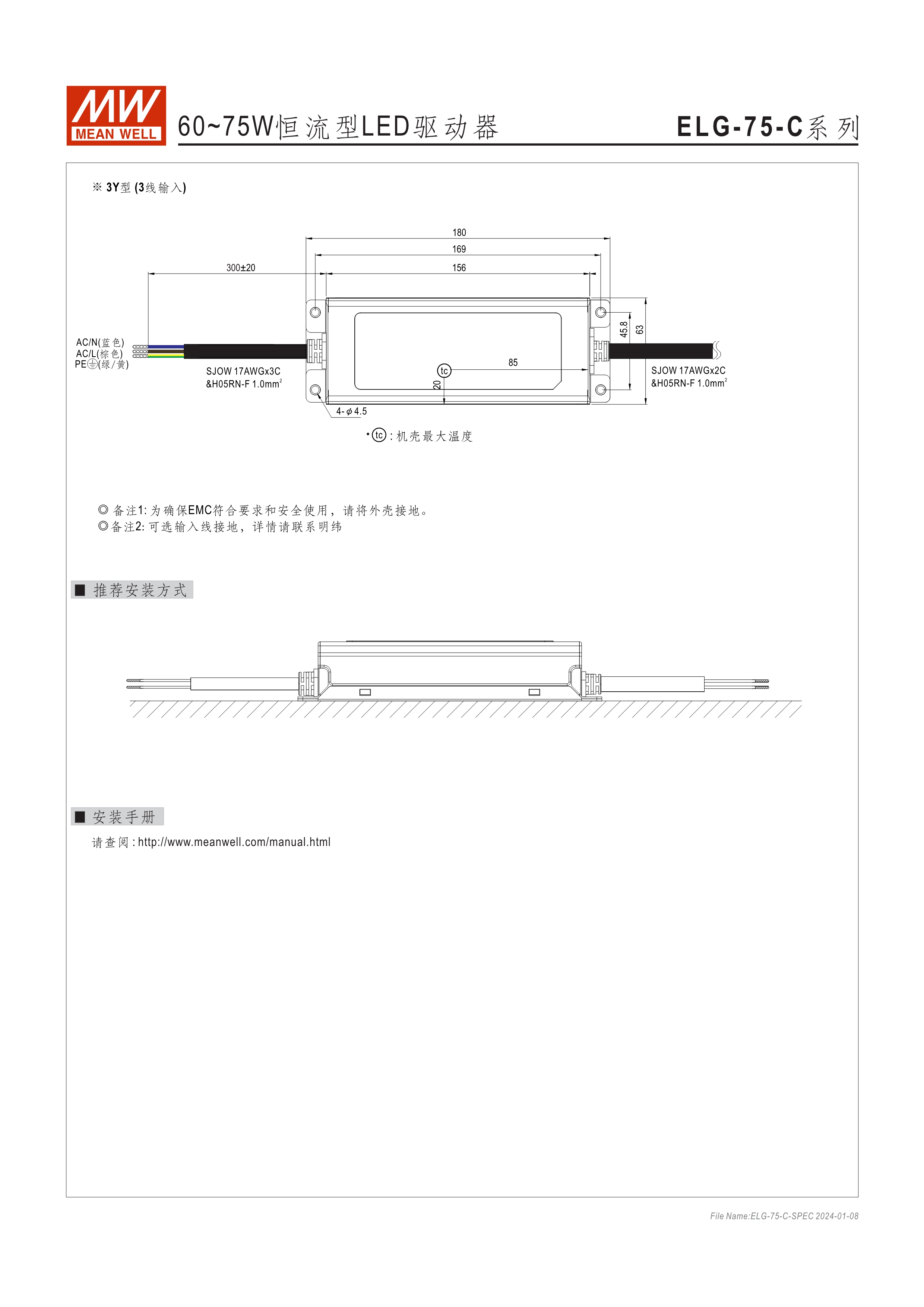 輸入范圍100~305VAC 恒流輸出機(jī)種 恒功率輸出機(jī)種(ELGC-300) 內(nèi)置主動(dòng)式PFC功能 空載/待機(jī)消耗<0.5W 金屬外殼,IP67/IP65防護(hù)等級可用于戶外與室內(nèi) 功能選項(xiàng) : 輸出可經(jīng)由電位器調(diào)整;三合一調(diào)光(0~10Vdc或10V PWM信號或電阻,可關(guān)斷);智能定時(shí)調(diào)光;DALI;輔助直流輸出(ELG-150-C BE-Type) Type "HL" LED電源適用在安裝于Class I, Division 2 類 危險(xiǎn)地點(diǎn)之照明燈具 適合于LED路燈及戶外LED照明等應(yīng)用 5年保固期