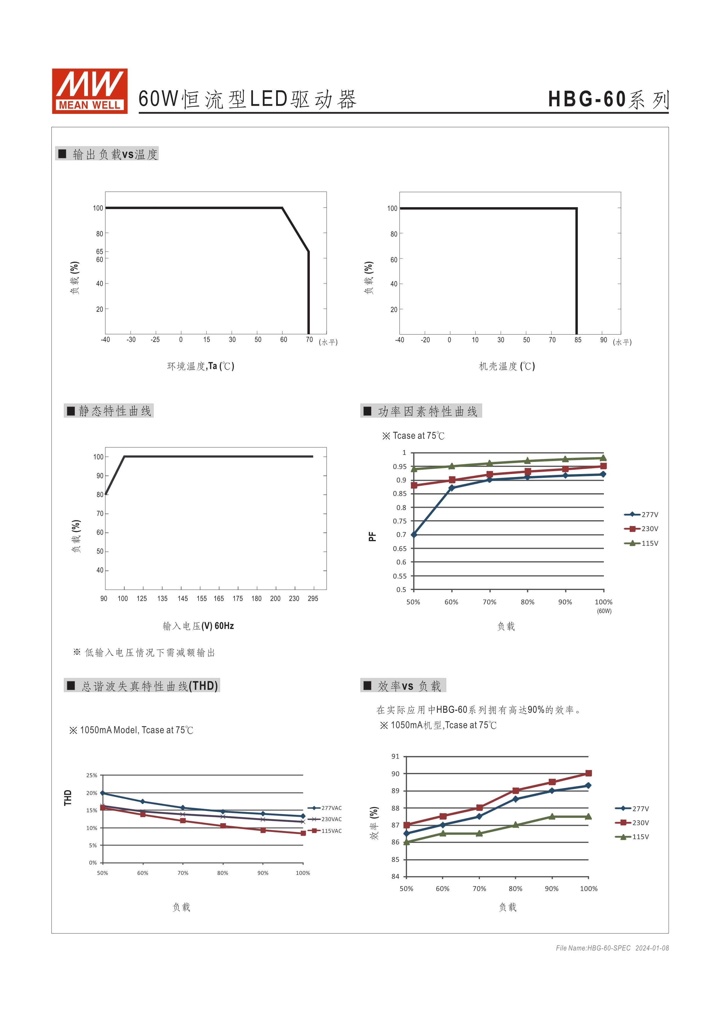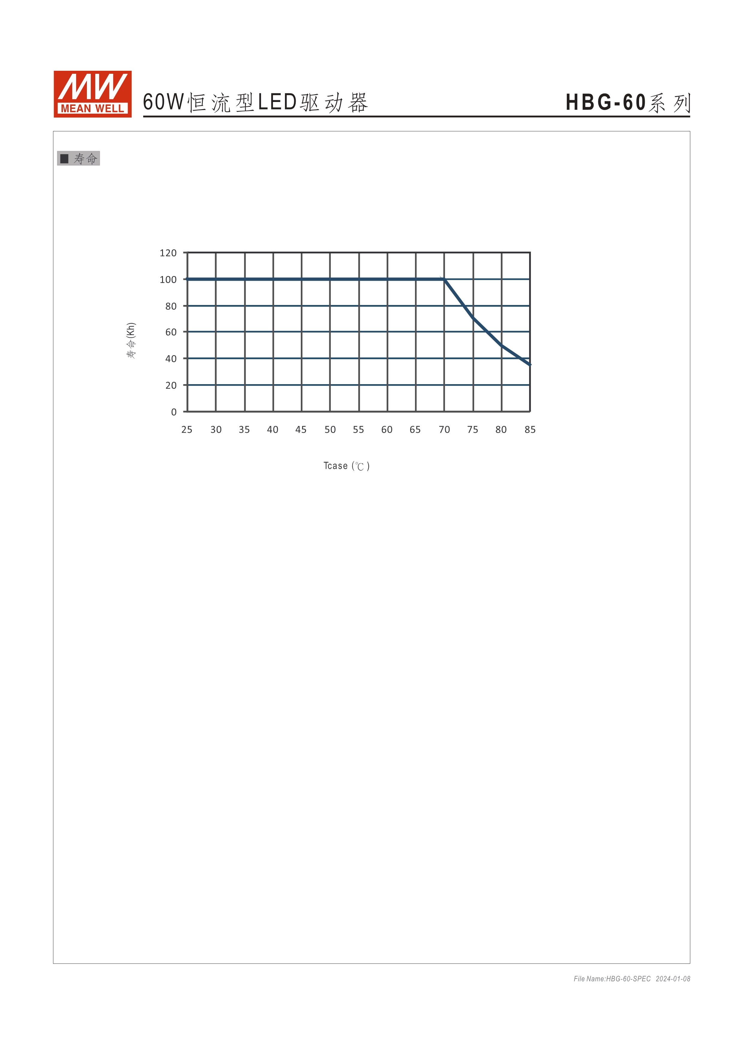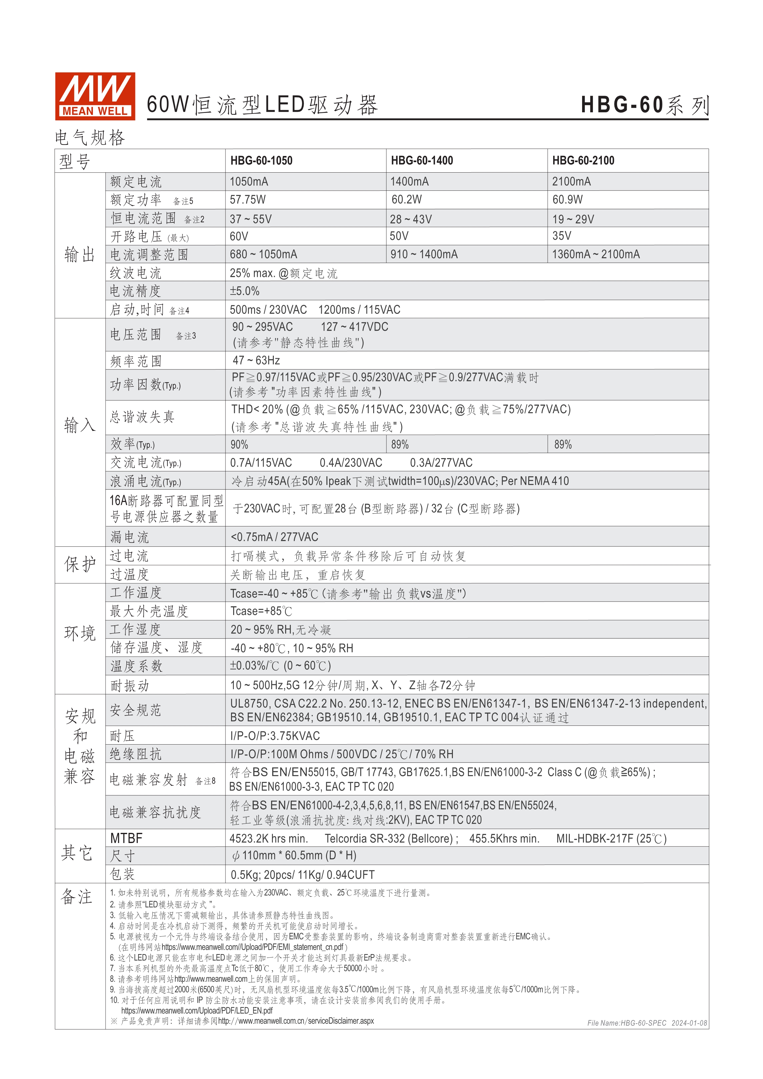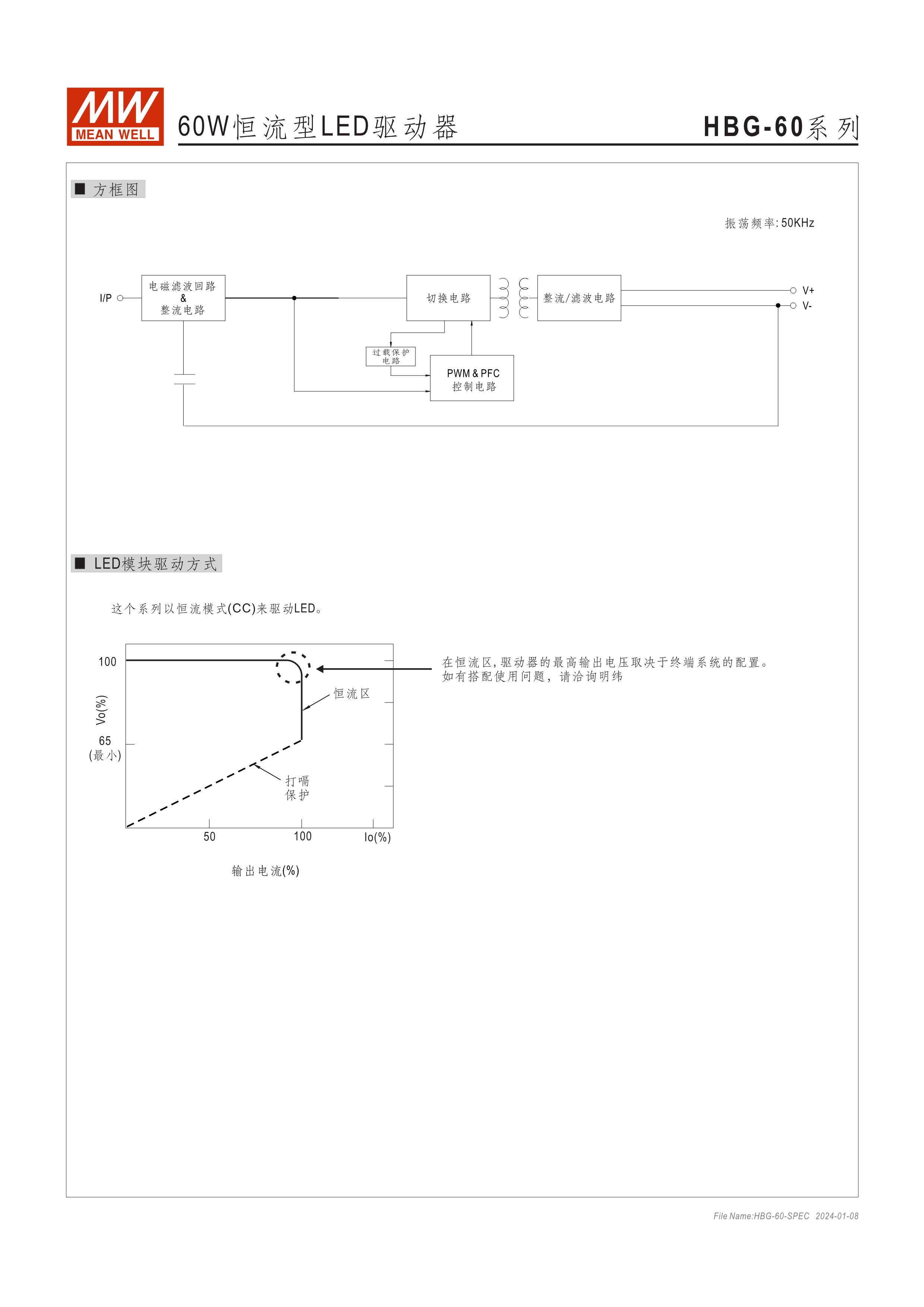 圓形外殼設(shè)計(jì) : HBG-60 :塑料外殼; HBG-100/160/240 :金屬外殼; HBG-60P/100P/160P/240P : PCB板型 90~305VAC交流輸入(HBG-60為90~295VAC), 內(nèi)建主動(dòng)式功率因子矯正功能(active PFC) IP67/IP65防護(hù)等級(jí)可用于戶(hù)外與室內(nèi)(HBG-100/160/240) HBG-100(P)/160(P)/240(P) B Type機(jī)種內(nèi)建三合一調(diào)光功能 (1~10VDC,PWM信號(hào)或電阻) Type "HL" LED電源適用在安裝于Class I, Division 2 類(lèi) 危險(xiǎn)地點(diǎn)之照明燈具(HBG-100/160) 適合于LED天井燈、舞臺(tái)燈、投光燈等照明應(yīng)用 5年保固期