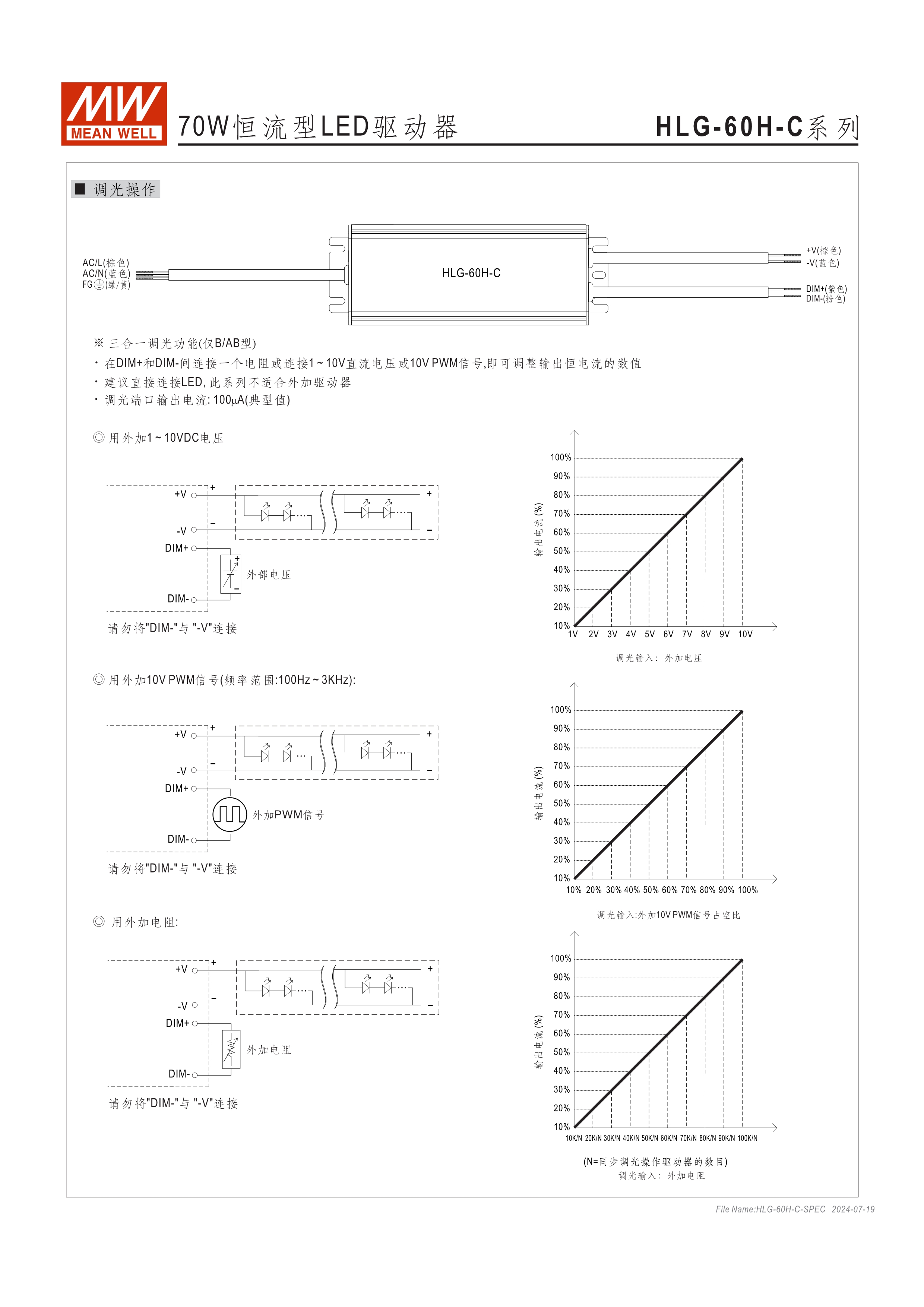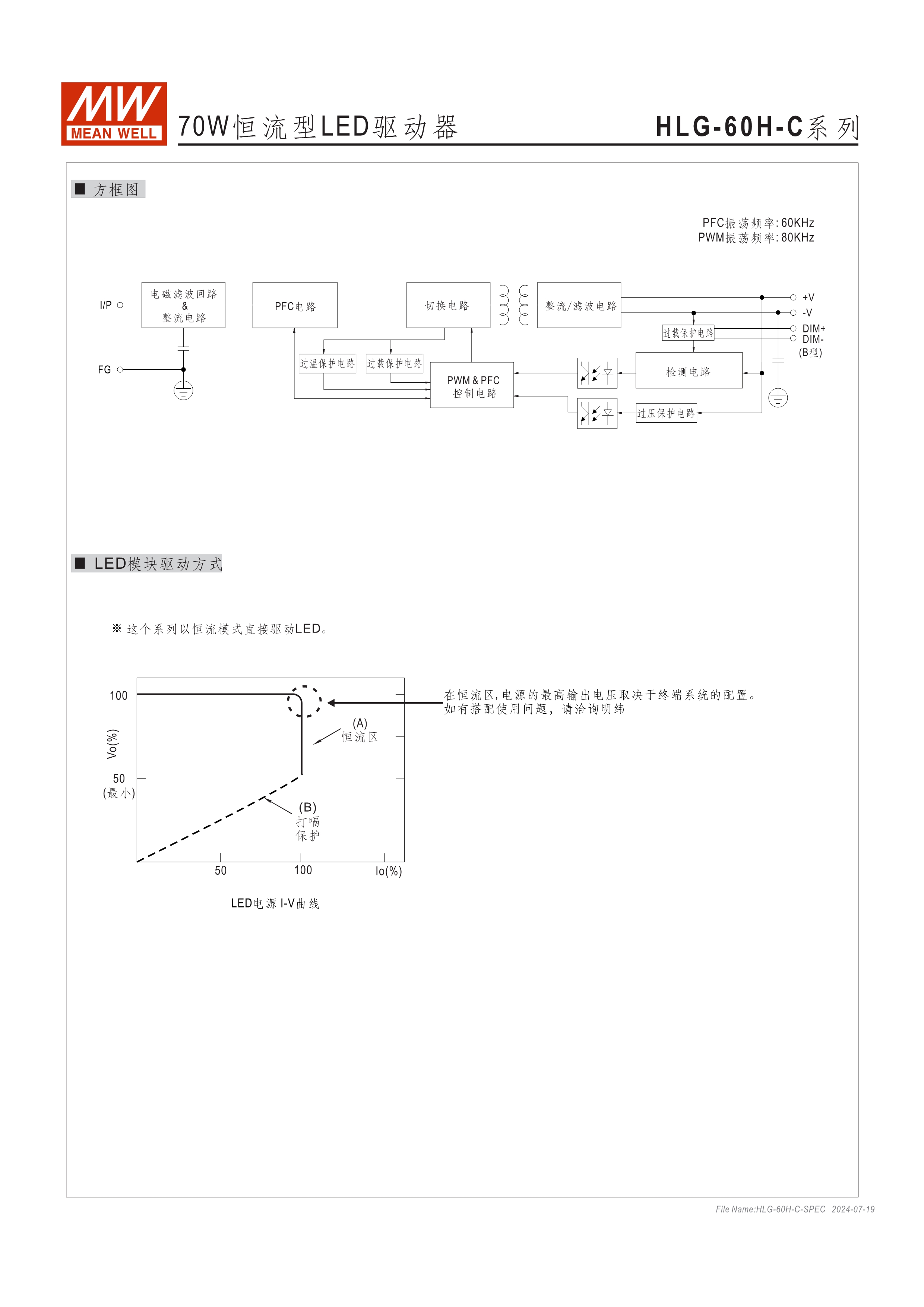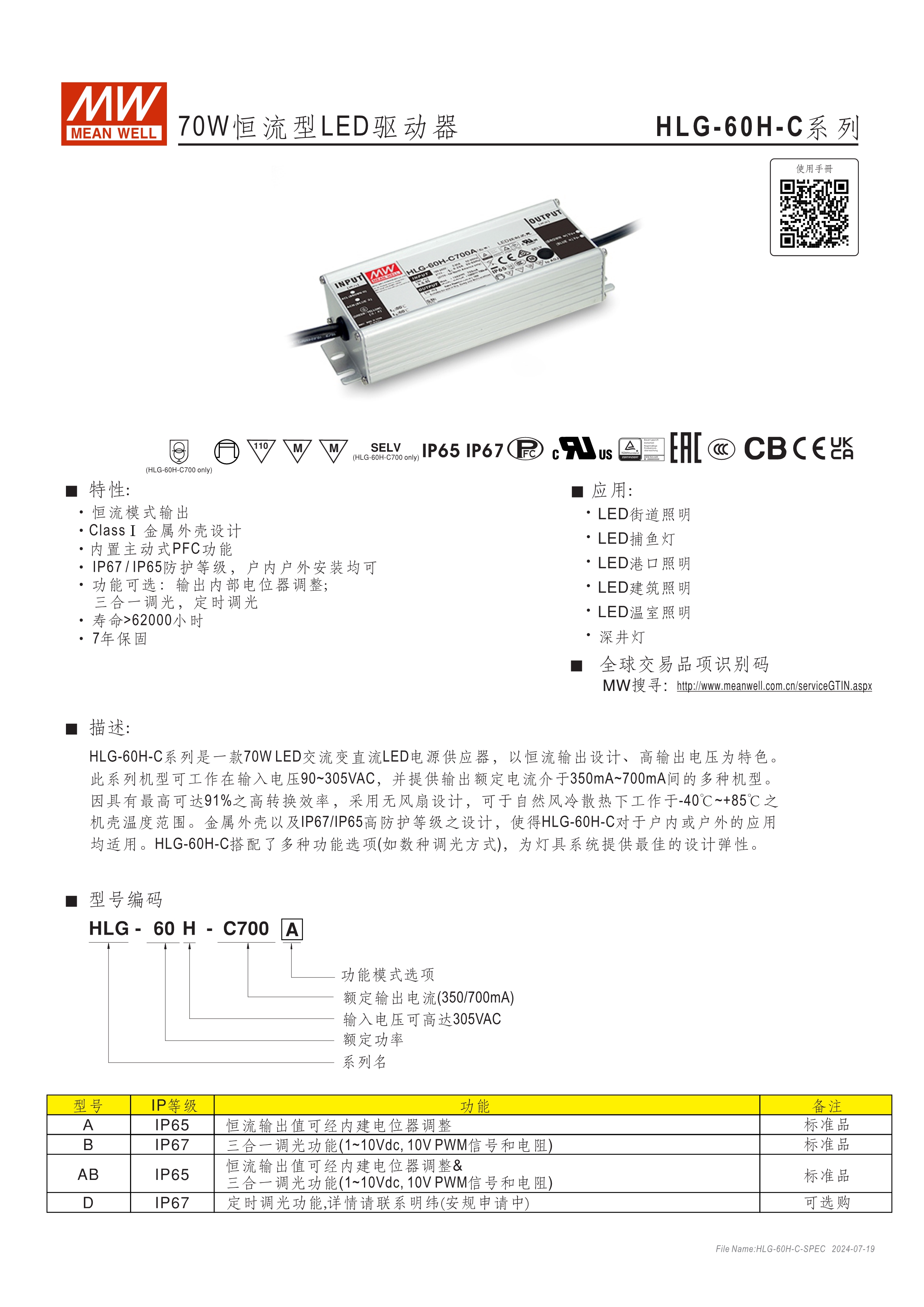 90~305VAC交流輸入,內(nèi)建主動式功率因子矯正功能(active PFC) 高壓(大于60VDC)恒流輸出機種 金屬外殼,IP67/IP65防護等級可用于戶外與室內(nèi) 功能選項 : 輸出可經(jīng)由電位器調(diào)整;三合一調(diào)光(1~10Vdc或10V PWM信號或電阻);定時調(diào)光;智能定時調(diào)光 Type "HL" LED電源適用在安裝于Class I, Division 2 類 危險地點之照明燈具 (僅HLG-240H-C/320H-C) 適合于LED路燈及戶外LED照明等應(yīng)用 7年保固期