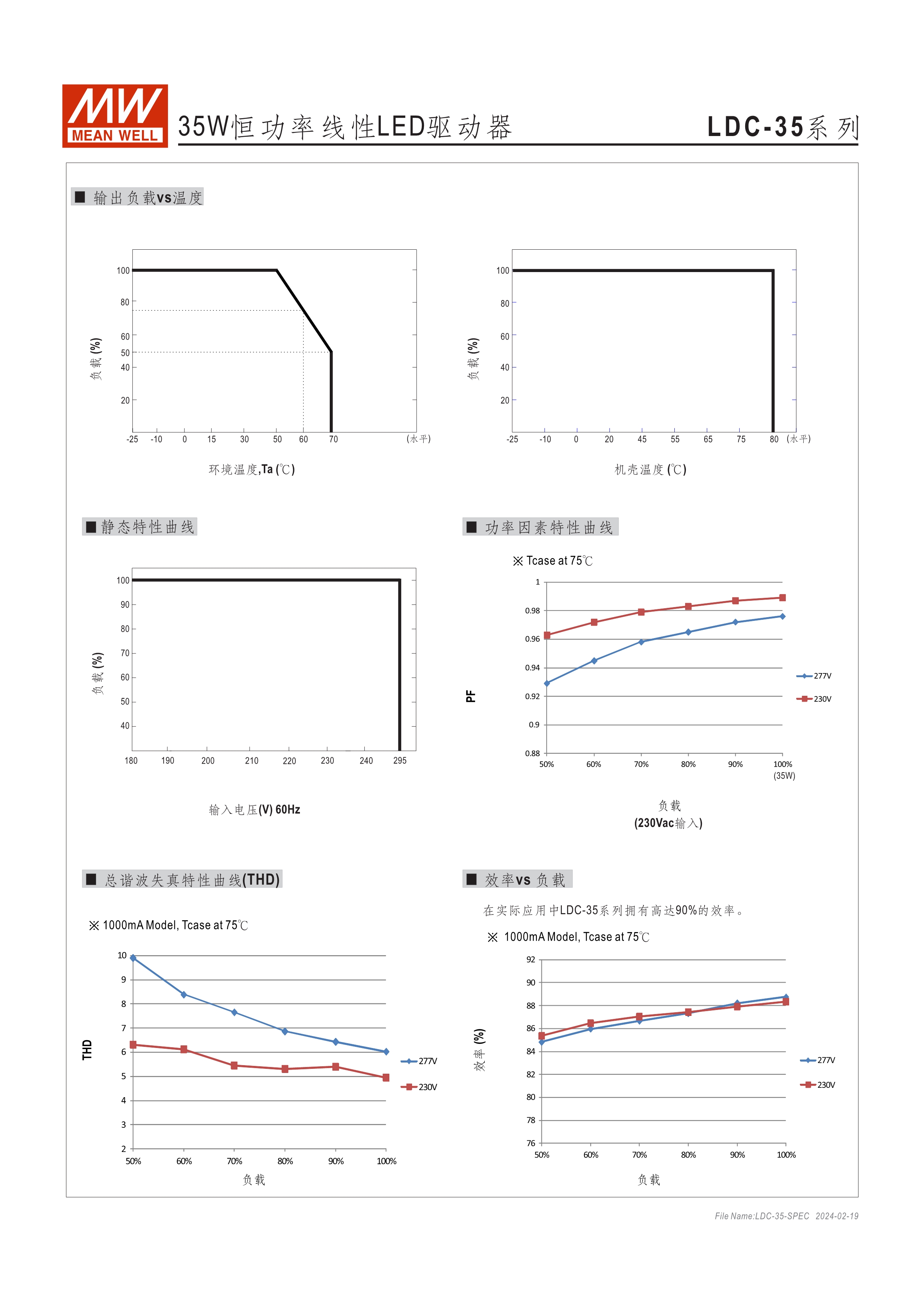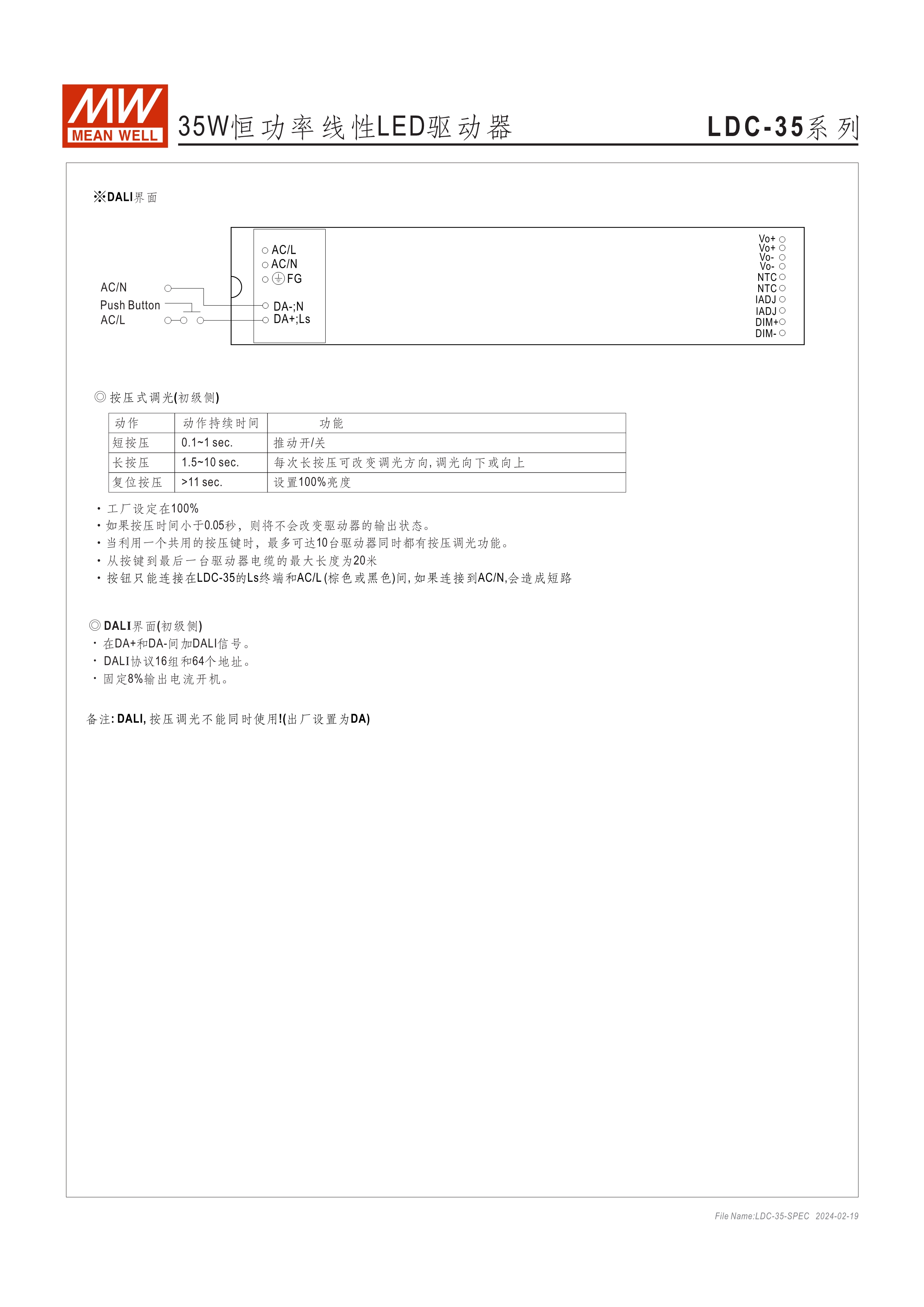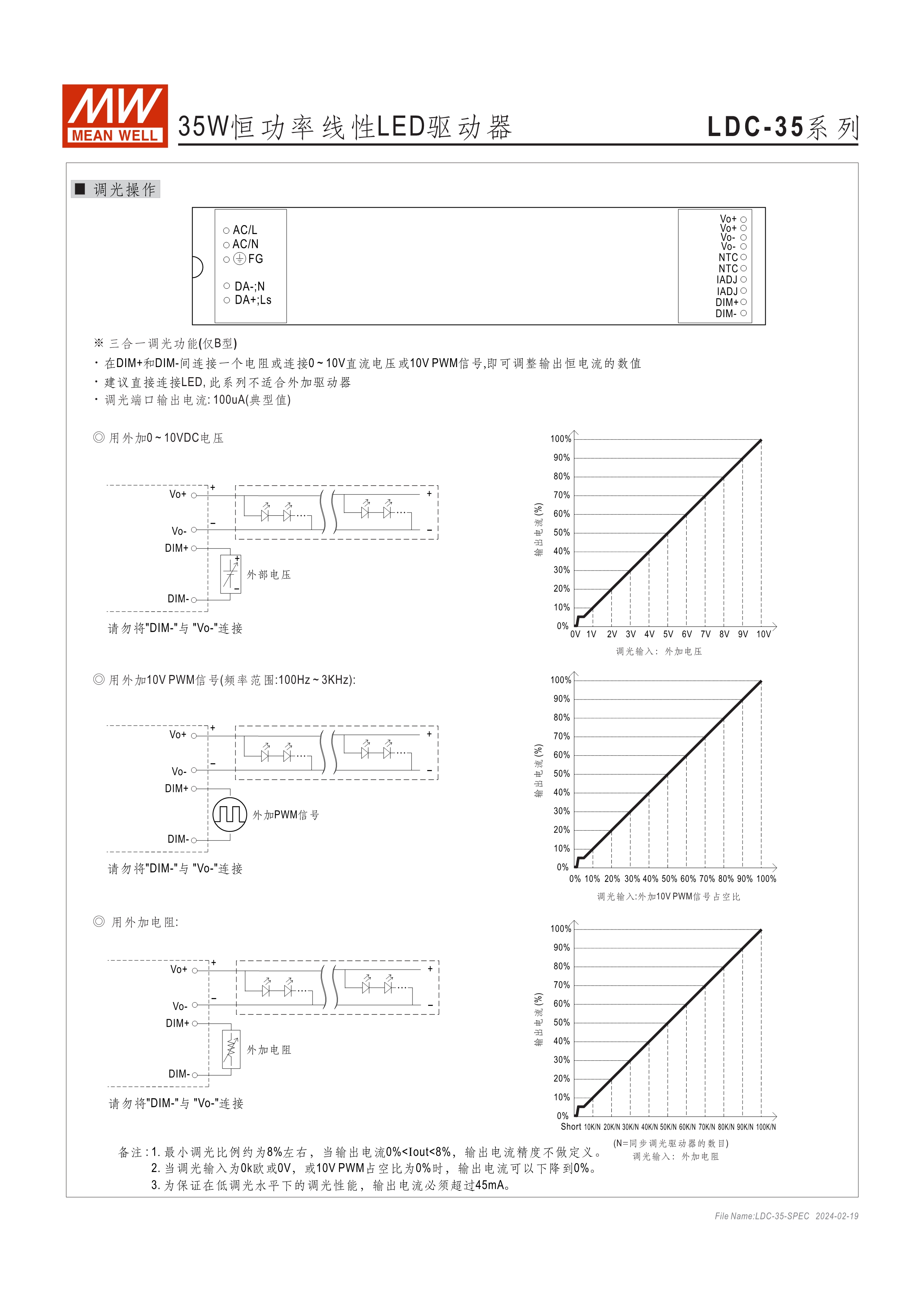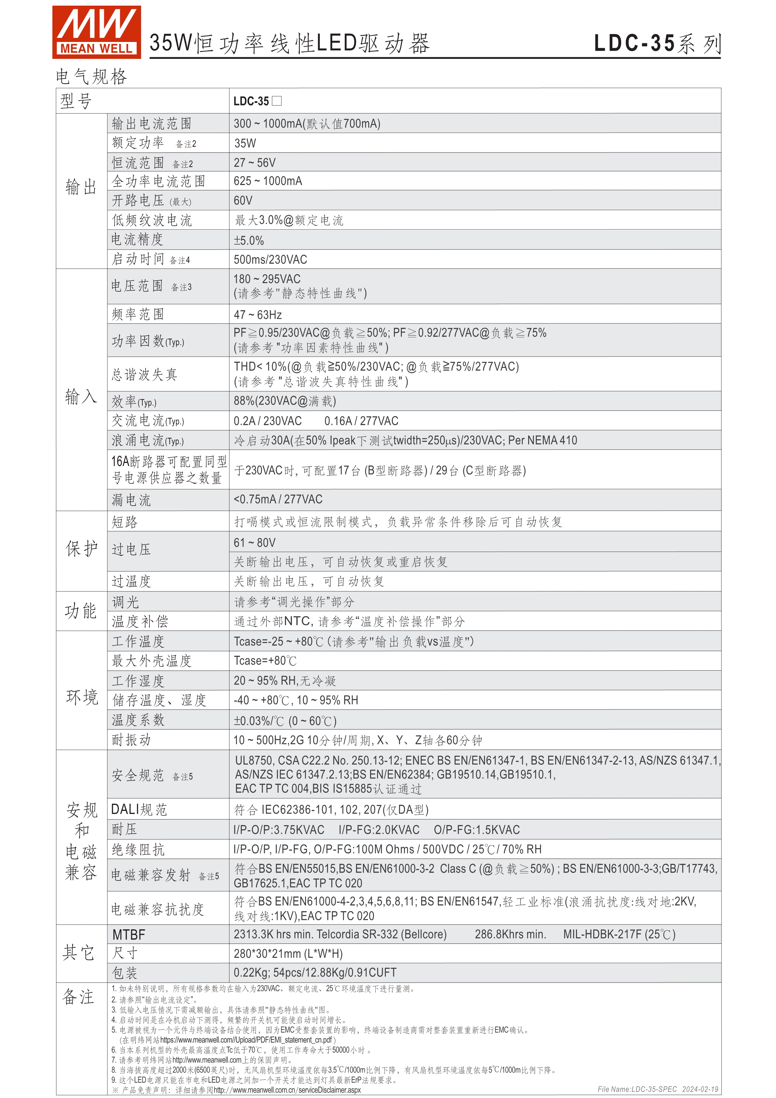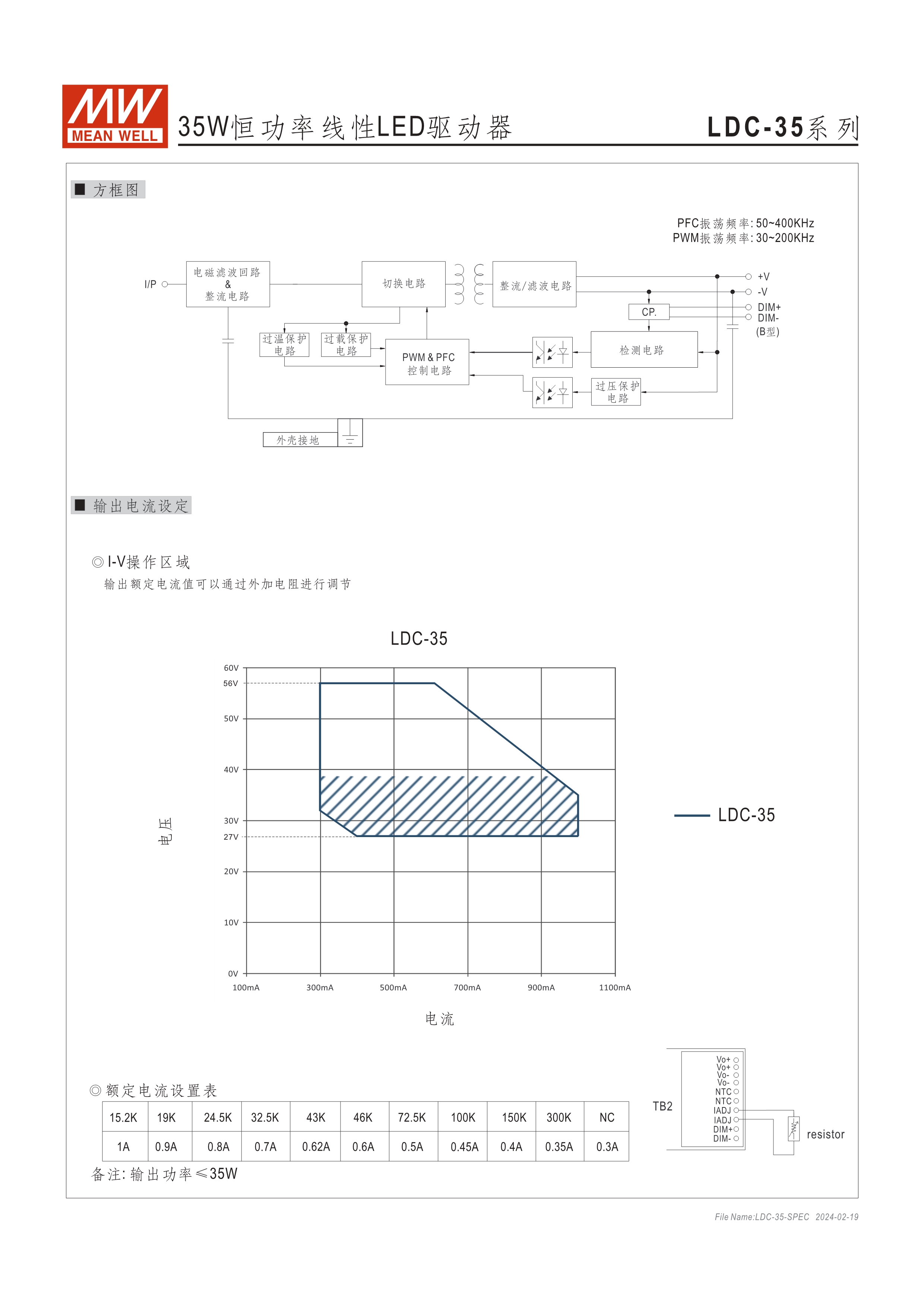 恒功率模式輸出,輸出電流可通過外接電阻設(shè)定 無頻閃設(shè)計(jì)(Fpcker free) 三合一調(diào)光功能:0~10Vdc、PMW調(diào)光、電阻調(diào)光 內(nèi)建主動式功率因子矯正功能(Active PFC) 低空載功耗: <0.5W 工作溫度: -25~+90℃ 保護(hù)種類:短路 UL/ENEC/TUV/CCC/CB/CE 認(rèn)證齊全 5年保固