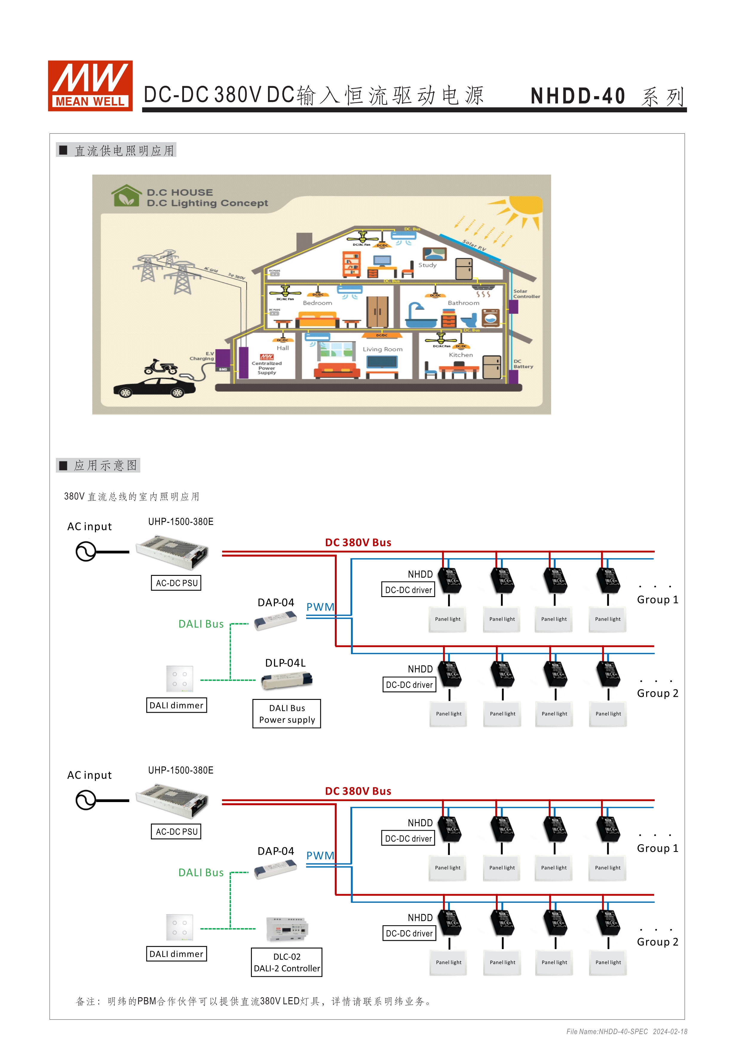 恒流模式輸出 為DC 380V BUS照明燈具提供電路板型(DoB)解決方案 塑料外殼和全封裝 內建PWM和遠程開關控制 保護:短路/過溫 5年保固