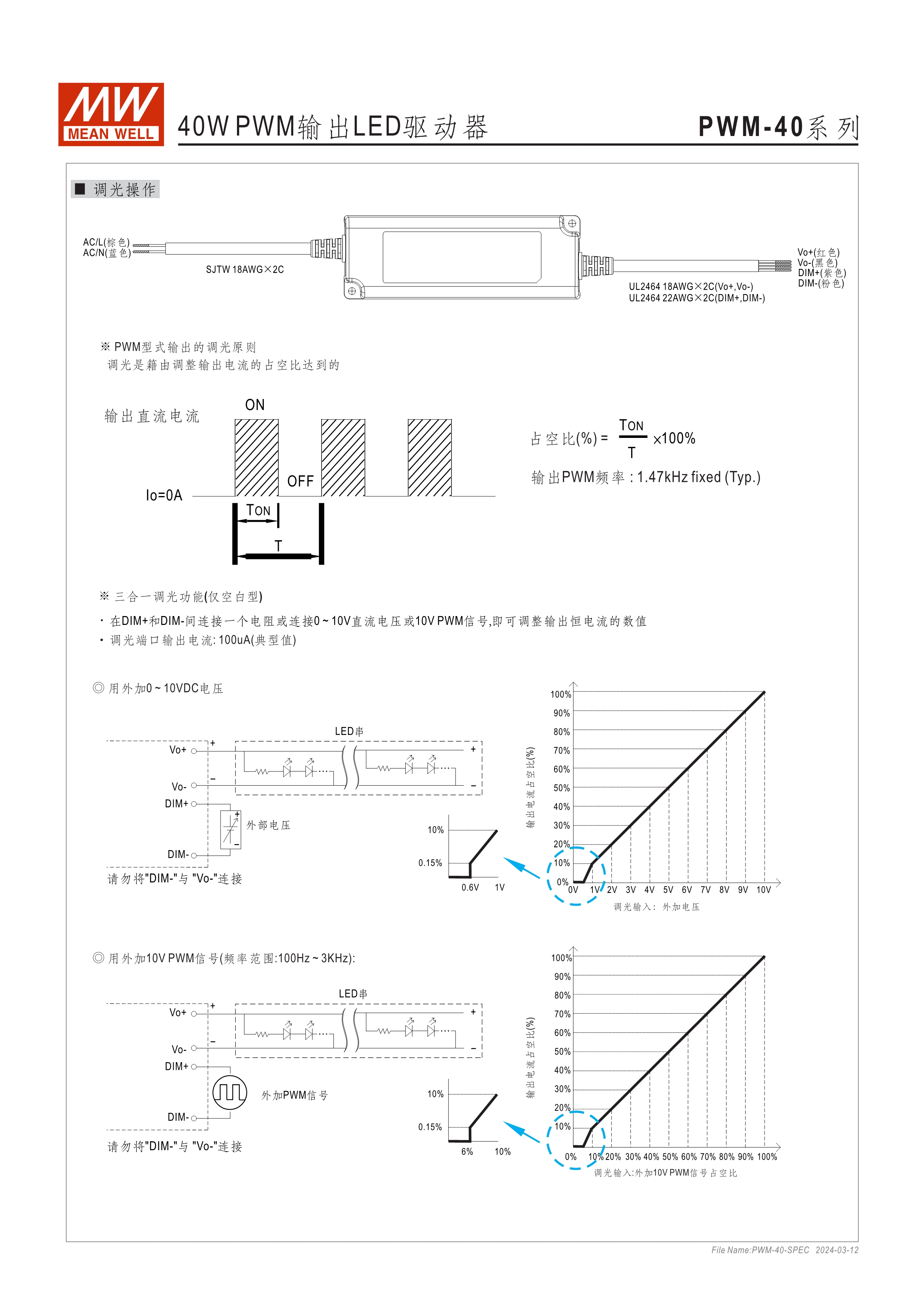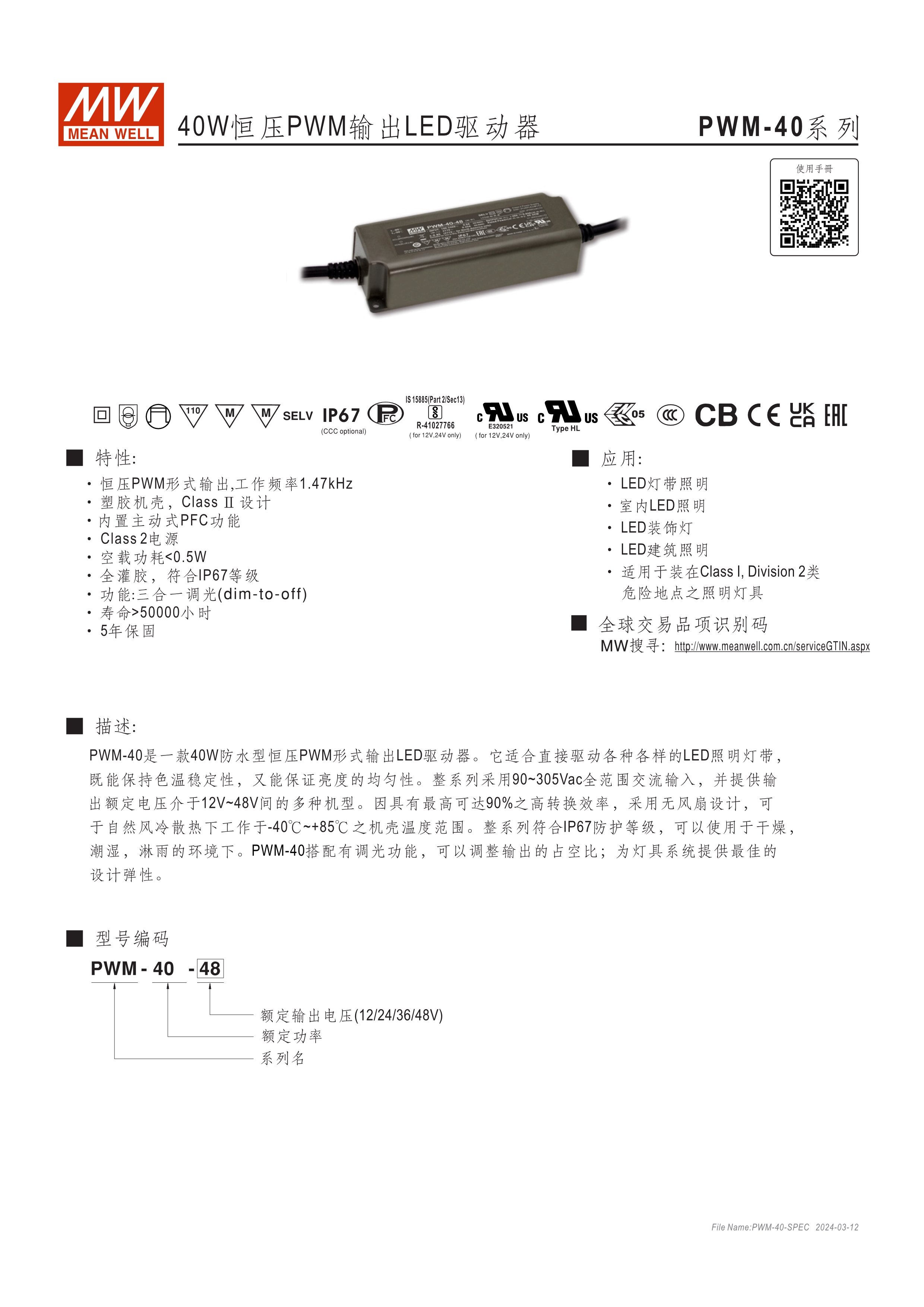 90~305VAC交流輸入, 內(nèi)建主動(dòng)式功率因子矯正功能(active PFC) 塑料外殼,IP67防護(hù)等級(jí) 恒壓PWM輸出 Class II設(shè)計(jì),無(wú)FG 空載待機(jī)消耗瓦數(shù)<0.5W 內(nèi)建三合一調(diào)光功能(0~10VDC, PWM信號(hào)或電阻,可關(guān)斷) 5年保固期