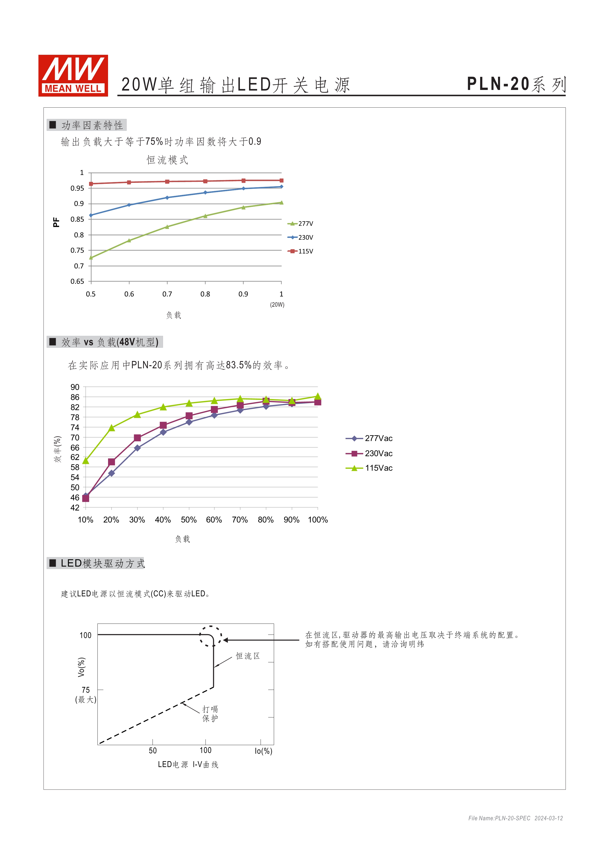 90~295VAC交流輸入(PLN-20為90~277VAC), 內(nèi)建主動式功率因子矯正功能(active PFC) 塑料外殼,IP64防護等級 適合于LED室內(nèi)照明及LED電子廣告牌相關(guān)應(yīng)用