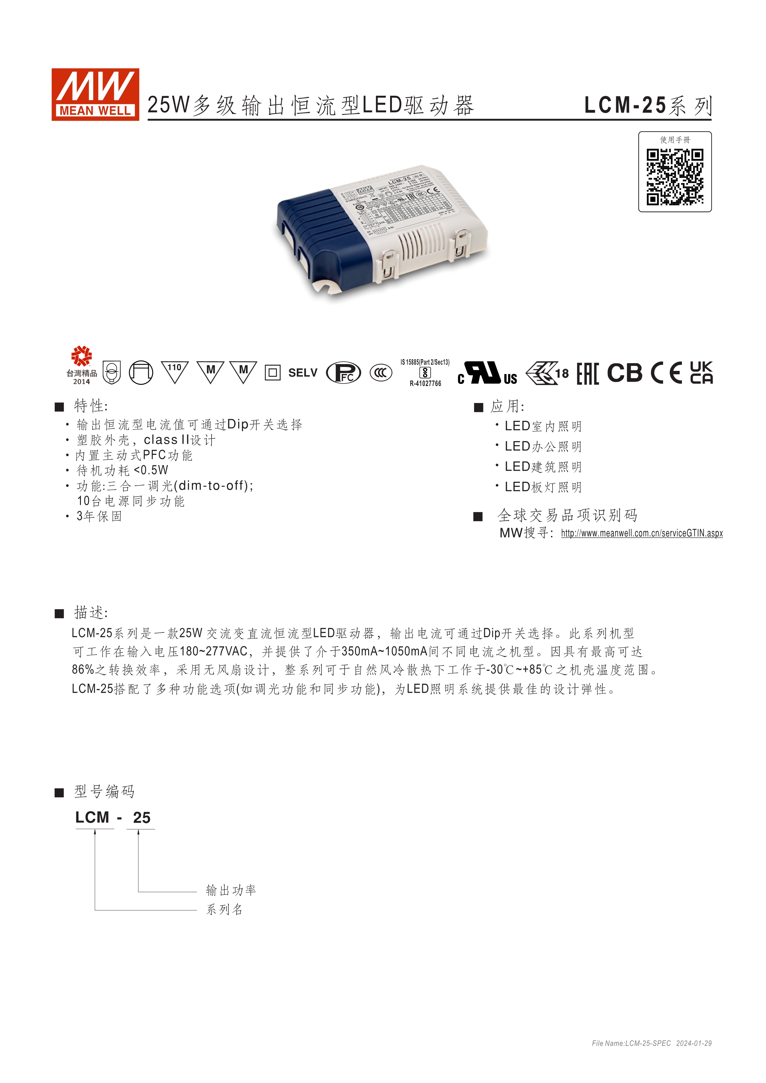 LCM-25(DA):180~277VAC交流輸入, LCM-40(DA)/60(DA):180~295VAC交流輸入 內(nèi)建主動(dòng)式功率因子矯正功能(active PFC) 塑料外殼 可透過指撥開關(guān)切換不同輸出電流檔位之多段式電源 LCM-25/40/60內(nèi)建三合一調(diào)光功能(0~10VDC, PWM信號(hào)或電阻,可關(guān)斷) LCM-25DA/40DA/60DA內(nèi)建DALI接口 和按鈕調(diào)光功能(Push Dim) LCM-40TW為2路輸出支持可溫(DT8)及調(diào)光(DT6)應(yīng)用 適合于LED室內(nèi)照明相關(guān)應(yīng)用