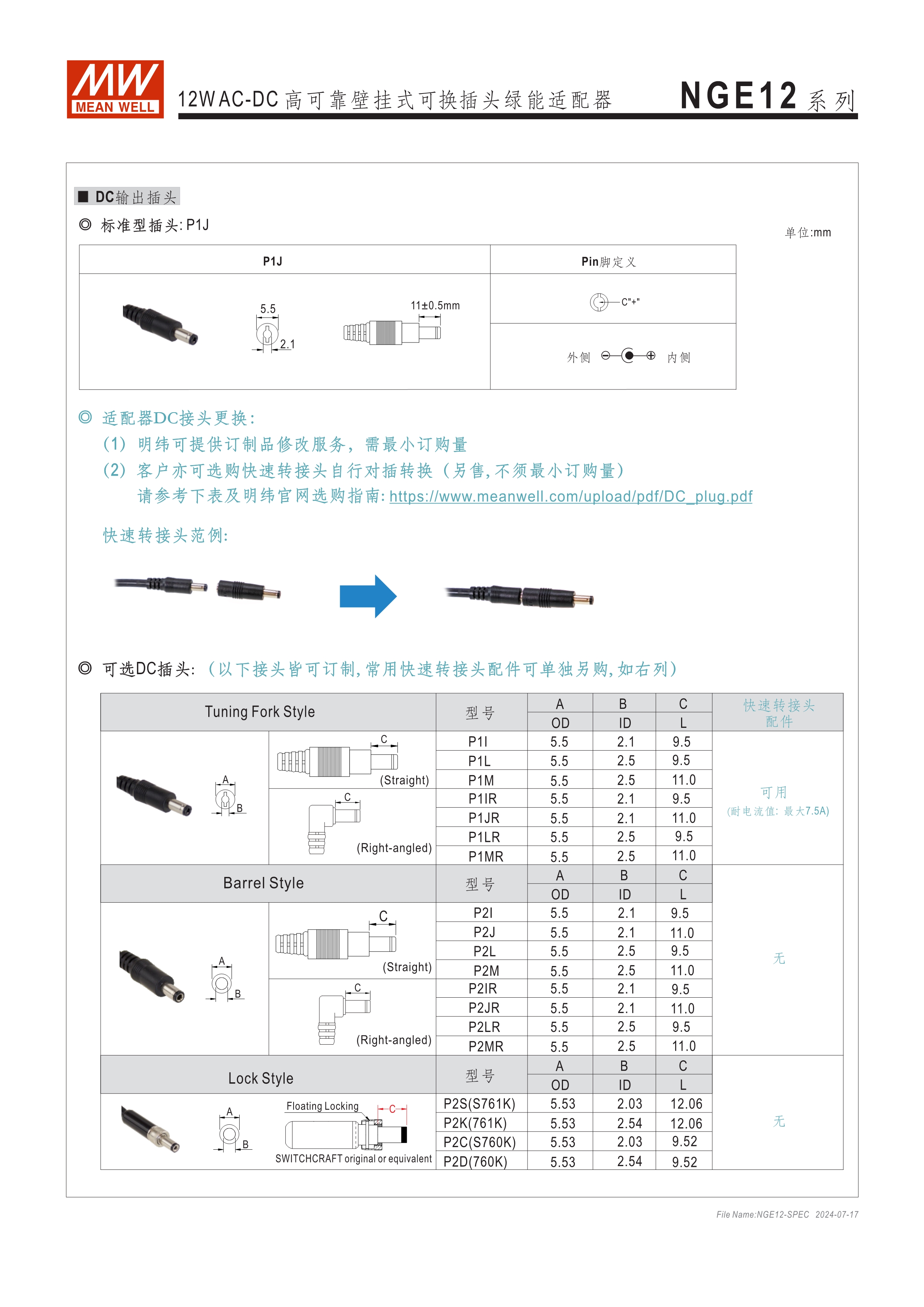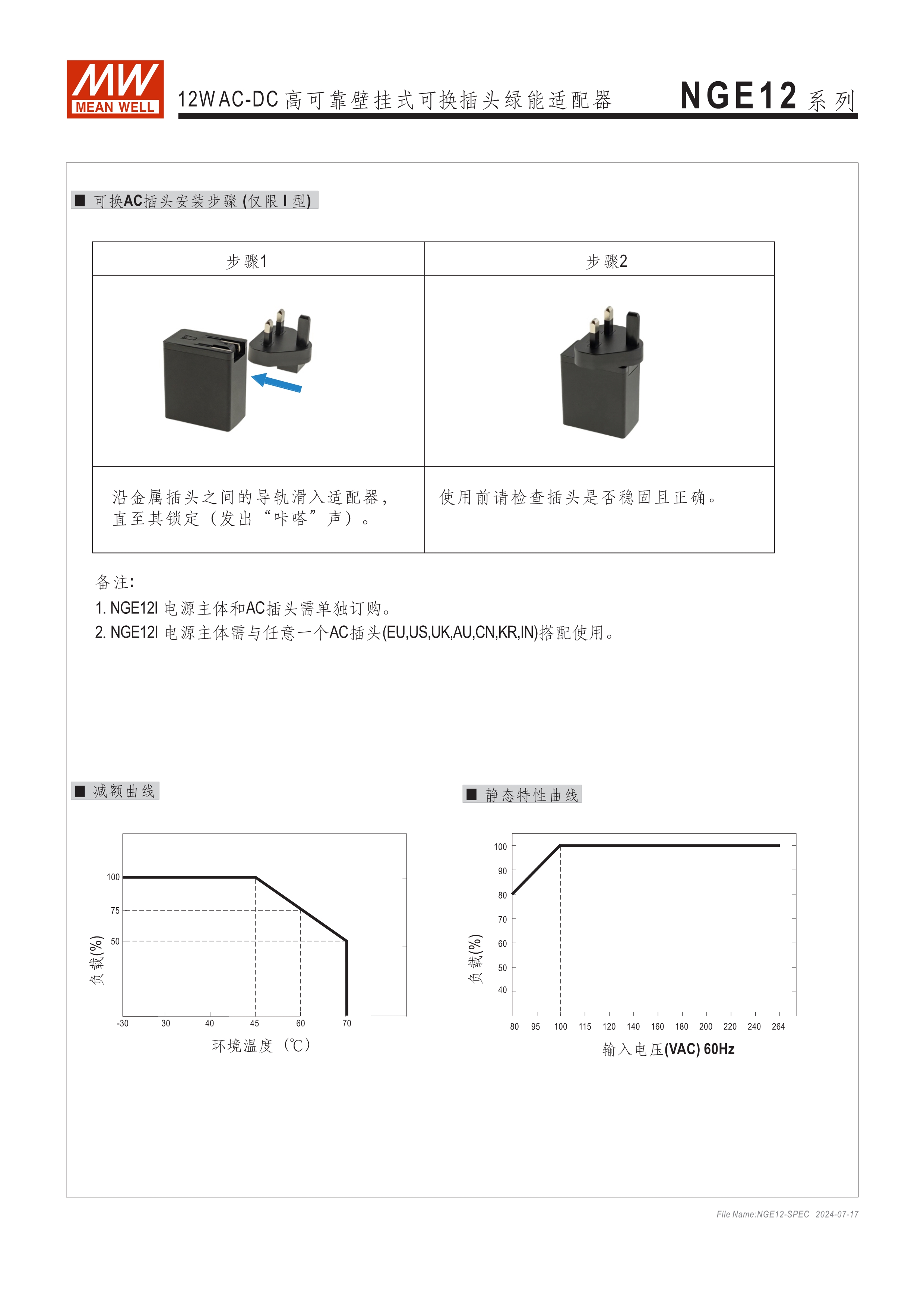 可換AC插頭 符合多領(lǐng)域全球認證 (信息類 62368-1、醫(yī)療 60601-1, 家用 60335-1、工業(yè) 61558-1/-2-16) 全范圍AC輸入 2xMOPP, BF應用 超窄面寬設(shè)計(28mm~30mm) 漏電流 <100uA 80~264V輸入 空載損耗<0.075W~0.1W 能效等級Level VII 保護功能:短路、過載、過電壓 漏電流 <100uA -30~70℃寬工作溫度 多種DC輸出轉(zhuǎn)接頭可更換 3年保固期