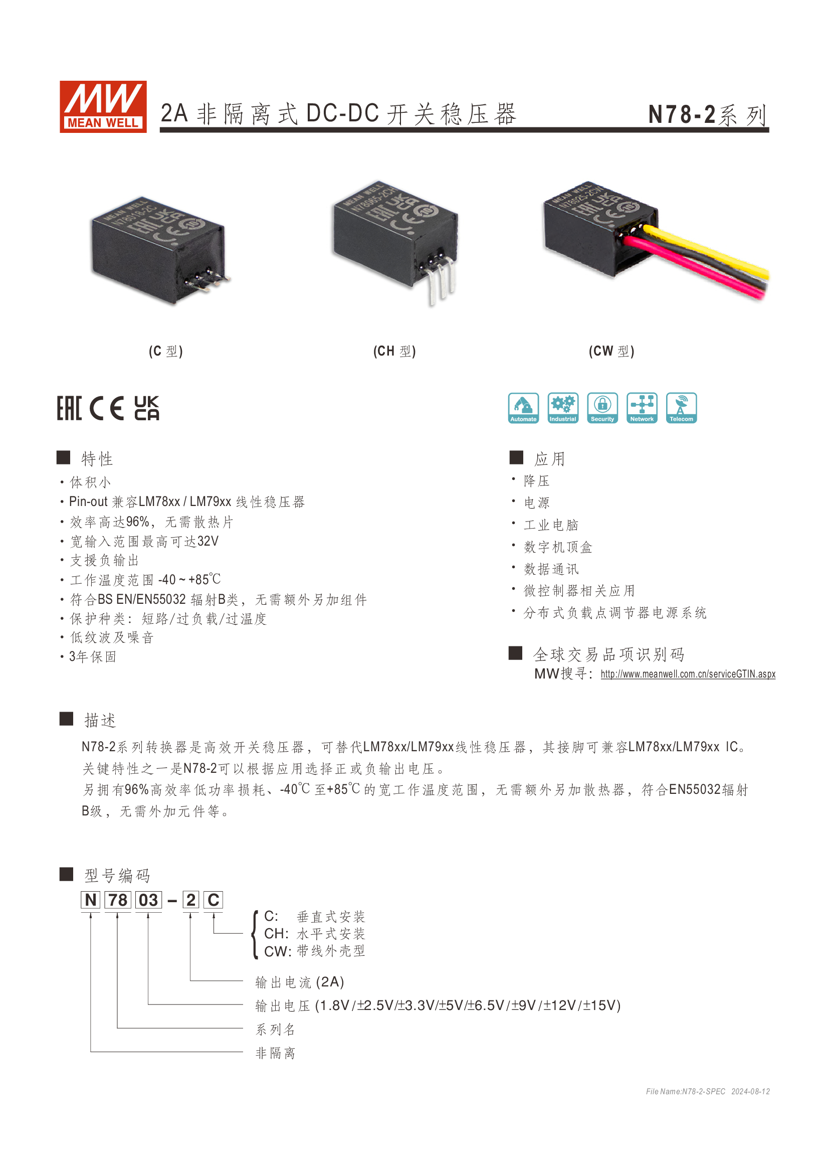 Pin-out 兼容 LM78xx/LM79xx 線性穩(wěn)壓器 效率高達(dá) 96%、無(wú)須散熱片 寬輸入范圍最高可達(dá) 32V 支援負(fù)輸出 工作溫度范圍:-40 ~ +85oC 符合 BS EN/EN55032 輻射 B 類、無(wú)需另加組件 保護(hù)種類:短路/過(guò)負(fù)載/過(guò)溫度 3 年保固