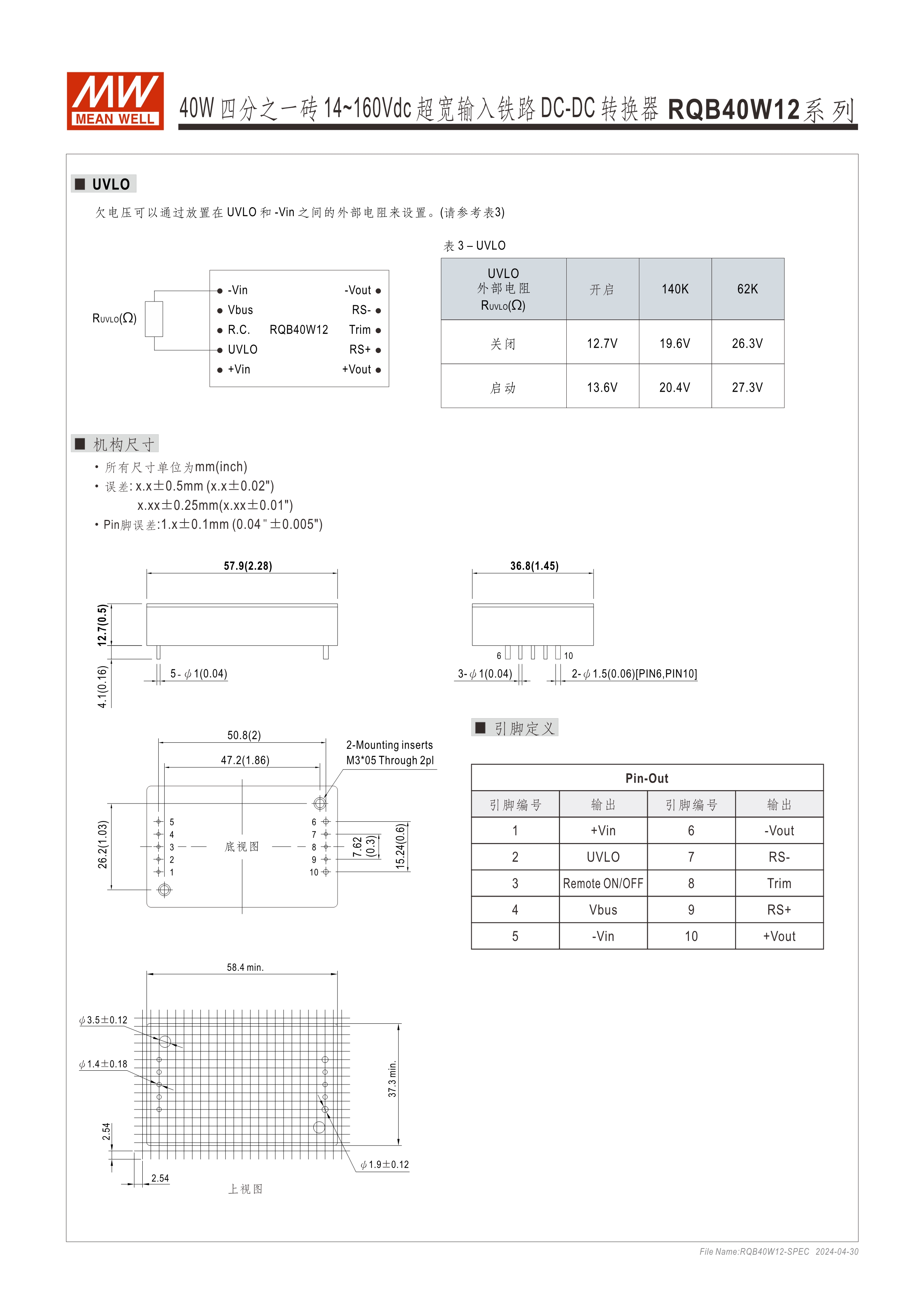 模塊型快選表 2.28” x 1.45” x 0.5”半磚尺寸 符合鐵路標(biāo)準(zhǔn)EN50155 40W: 12:1(14~160Vdc)超寬輸入范圍 ; 150W: 3:1(60~160Vdc)超寬輸入范圍 寬工作溫度范圍-40~+90oC 無(wú)需最低負(fù)荷 全封裝