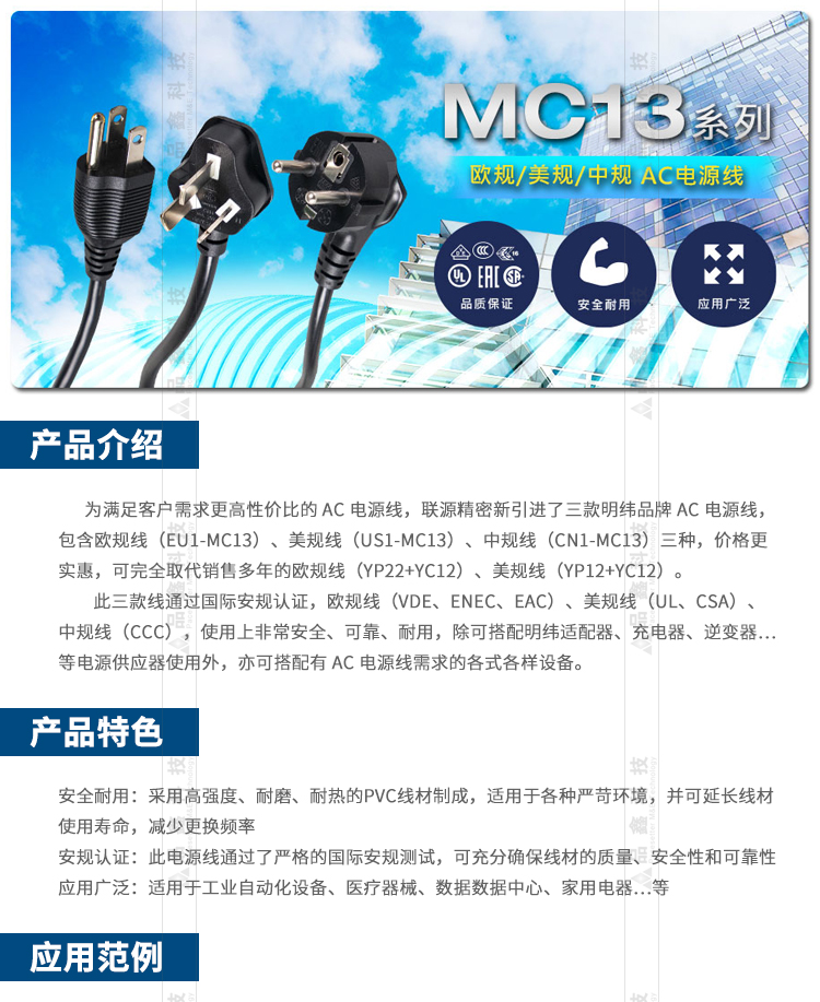 CN1-MC13 明緯電源AC電源線 聯(lián)源精密 工控配件電源線材線束1.5米